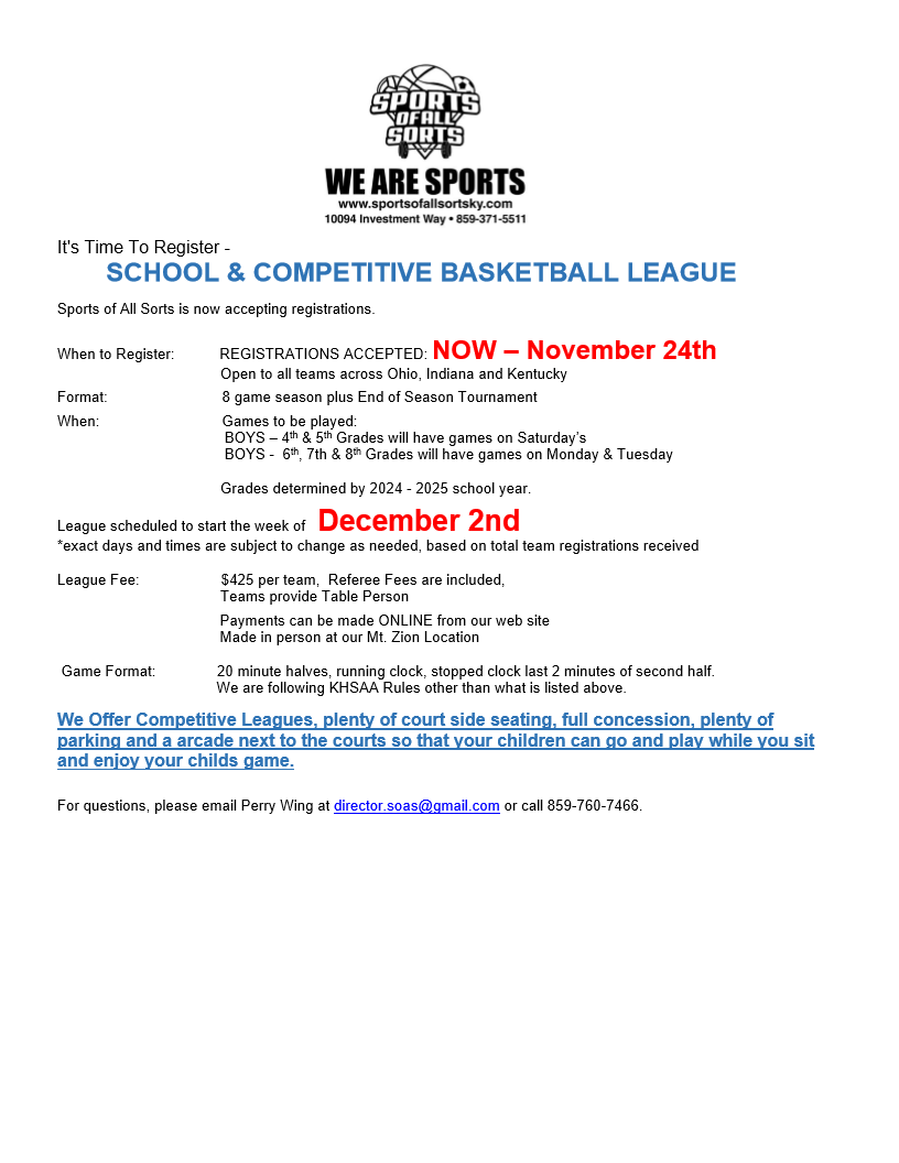 For Information regarding upcoming league registration, please visit our home page and click on the link “Upcoming league Registration” for dates of registration, fees, and start dates